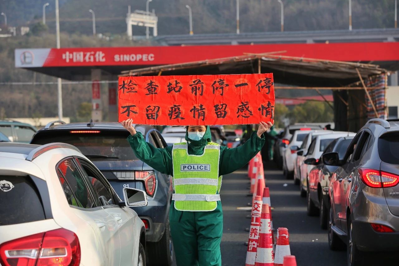 如何缓解车主的焦躁情绪?舟山市公安局定海区分局想出了一个办法:他们用硬纸板做了一个宣传牌,贴上红纸写上了一句委婉又暖心的话,“检查站前停一停,不留疫情留感情”。希望能通过这样的方式缓解车主的焦虑心情。但现场警力紧张,谁来举呢?