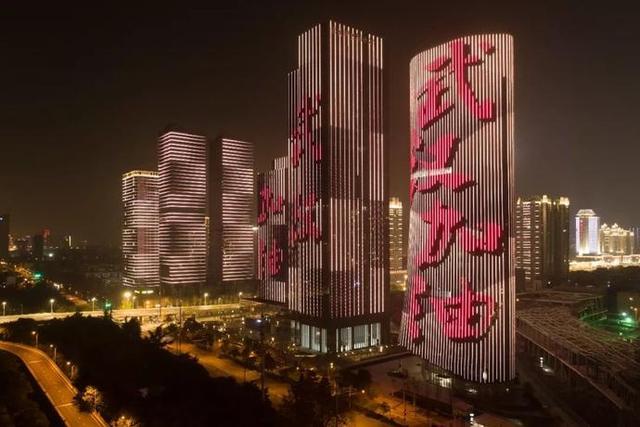 1月31日,武汉市武昌区高层建筑外墙打出“武汉加油”字样(无人机照片)。来源:新华社