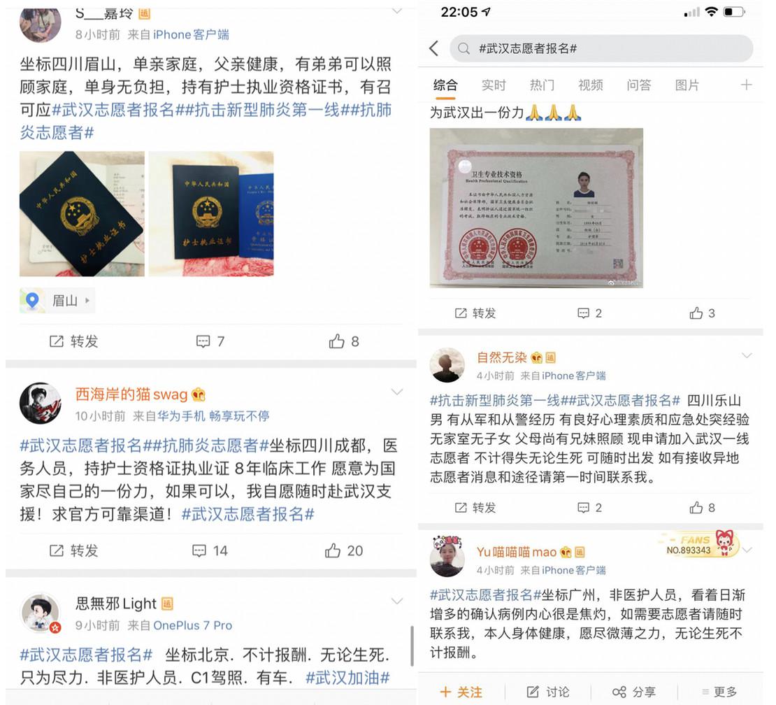 与此同时,微博发起了一个“武汉志愿者报名”的话题,仅仅一周时间,就引发了300万关注量,几千人发布了请战帖,里面提及最多的就是“不计得失,无论生死”。