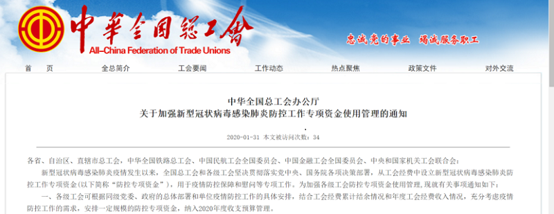 其中,为规范工会疫情防控专项资金使用管理,全国总工会于近日印发《中华全国总工会办公厅关于加强新型冠状病毒感染肺炎防控工作专项资金使用管理的通知》(以下简称《通知》)。