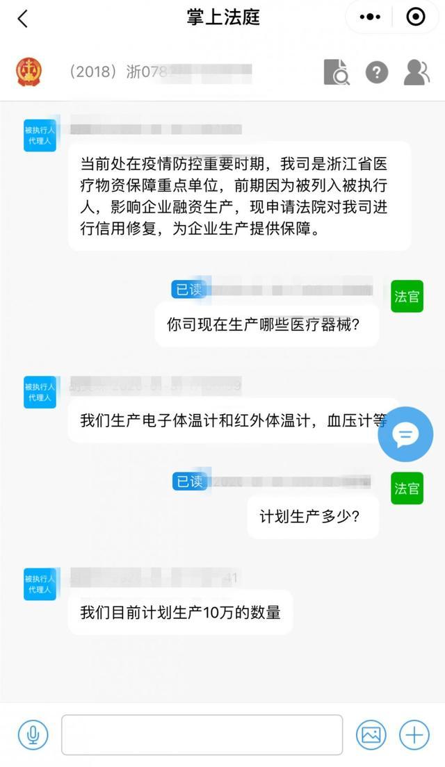 1月31日下午,浙江省义乌市人民法院执行人员在移动微法院上告知义乌市某医疗器械有限公司,其提出的信用修复申请已通过审核,此后,该公司将获得更多融资,用于扩大生产,制造更多红外线体温计、电子体温计等医疗器械供于疫情防控。