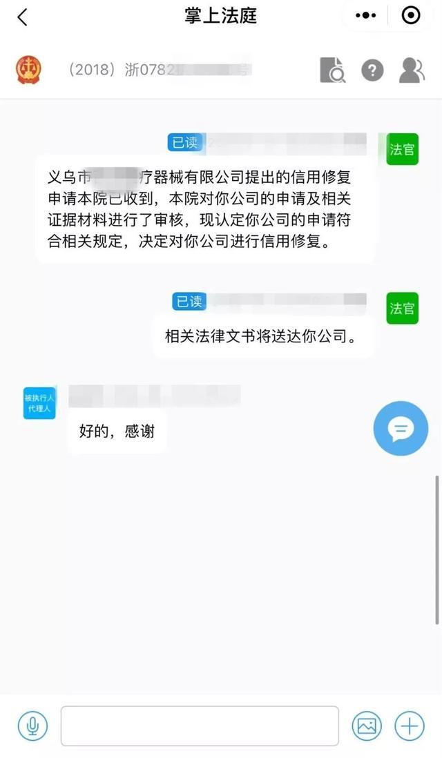 “义乌市某医疗器械有限公司,经本院审核,决定对你公司进行信用修复,相关文书将送达给你公司。”