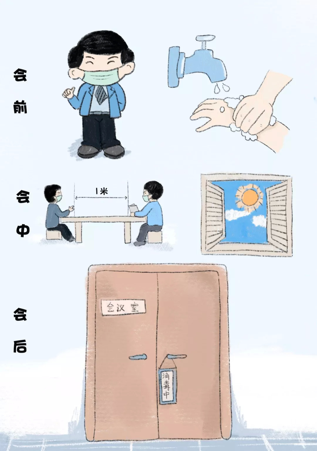 建议佩戴口罩,进入会议室前洗手消毒。开会人员间隔1米以上。减少集中开会,控制会议时间,会议时间过长时,开窗通风1次。会议结束后场地、家具须进行消毒。茶具用品建议开水浸泡消毒。