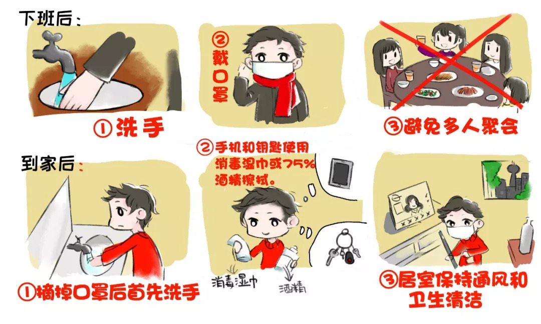 洗手后佩戴一次性医用口罩外出,回到家中摘掉口罩后首先洗手消毒。手机和钥匙使用消毒湿巾或75%酒精擦拭。居室保持通风和卫生清洁,避免多人聚会。