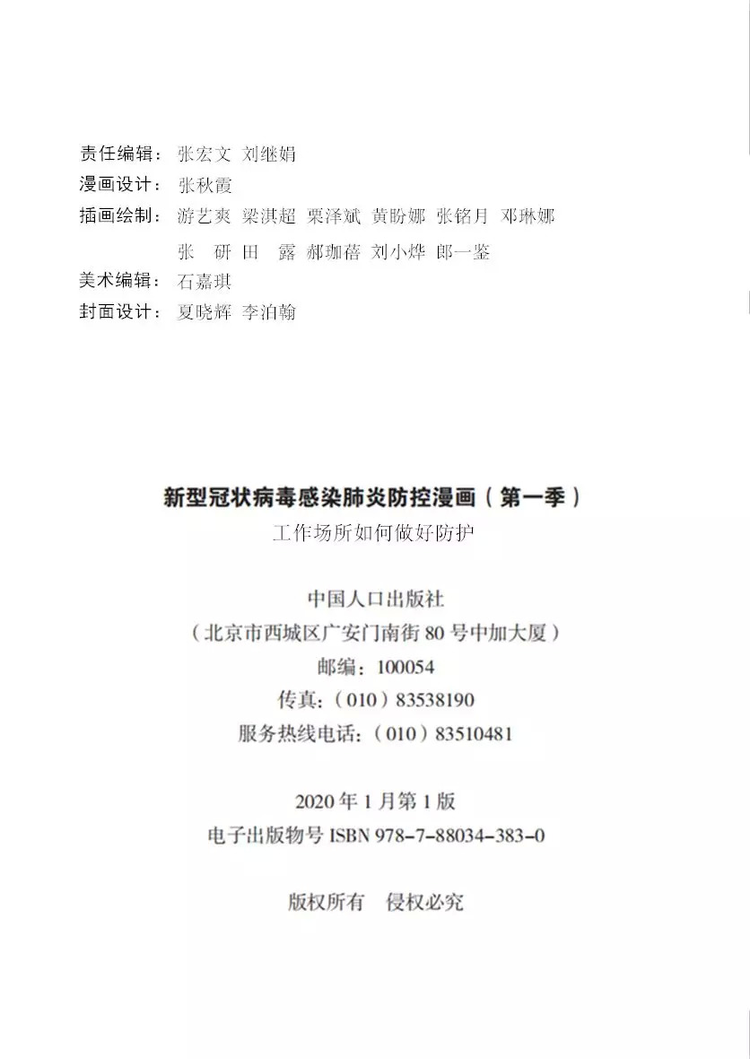 疫情就是命令,防控就是责任。为打赢新型冠状病毒感染肺炎疫情防控阻击战、切实保障人民身体健康和生产生活秩序,遵照党中央指示和国家卫生健康委部署,中国人口出版社在健康科普专家委员会的指导下,联合中华医学网工作团队编辑出版《新型冠状病毒感染肺炎防控漫画》。分5季推出:第一季,工作场所如何做好防护;第二季,怎样做好个人防护;第三季,居家怎样防护;第四季,新型冠状病毒肺炎简介;第五季,如何正确就医及就医注意事项。在春节假期即将结束之际,我们先期推出第一季。