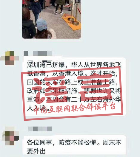 谣言:近日,一则“深圳湾已挤爆,本周将有二十万海外华人从深圳入境”的消息在网上流传。