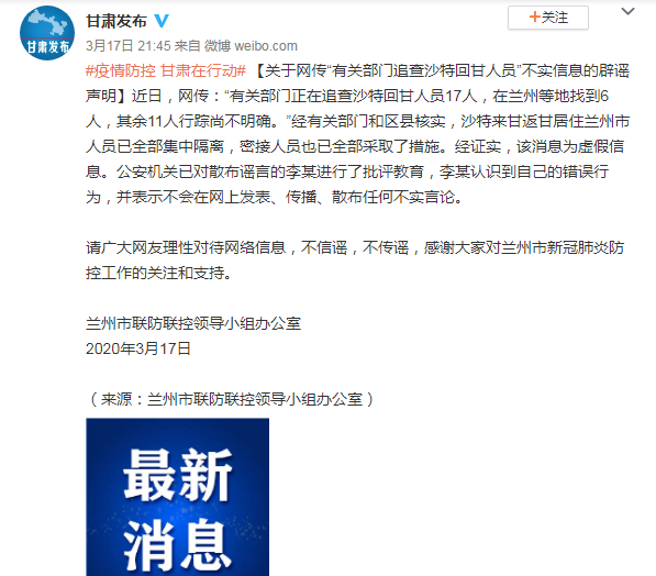 真相:网传内容系虚假信息。兰州市联防联控领导小组办公室表示,经有关部门和区县核实,沙特来甘返甘居住兰州市人员已全部集中隔离,密接人员也已全部采取了措施。公安机关已对散布谣言的李某进行了批评教育。