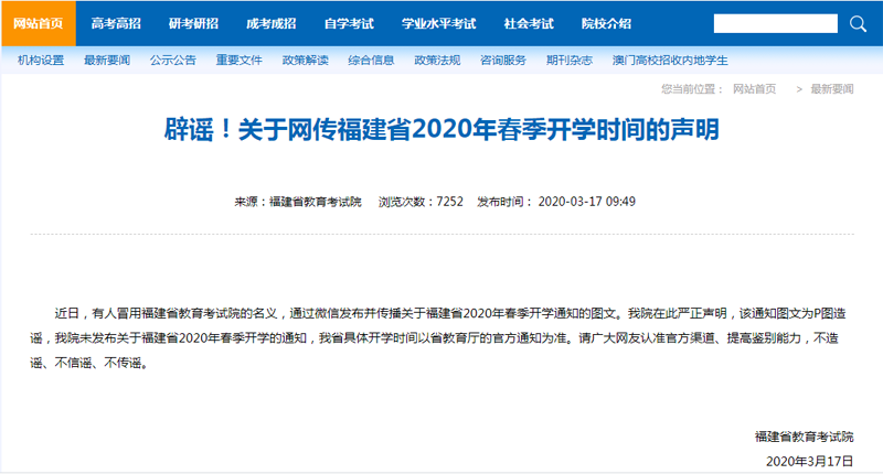 真相:3月17日,福建省教育考试院发表声明辟谣,表示网传“通知”为P图造谣,该院未发布关于福建省2020年春季开学的通知,福建省具体开学时间以省教育厅的官方通知为准。