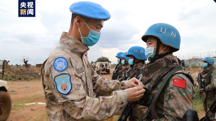 仪式现场,中国第六批维和步兵营官兵代表整齐列队,他们头戴贝雷,脚踏战靴,身着星空迷彩,精神抖擞,意气风发。中国驻南苏丹大使华宁、联南苏团副特别代表丛光等为官兵代表佩戴勋章。授勋结束后,中国赴南苏丹维和步兵营营长韩涛来到执勤一线,为不能参加现场授勋的执勤官兵佩戴勋章。