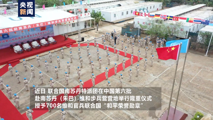 近日,联合国南苏丹特派团在中国第六批赴南苏丹(朱巴)维和步兵营营地举行仪式,授予700名维和官兵联合国“和平荣誉勋章”,以表彰他们一年来执行维和任务期间的卓越表现和为南苏丹和平事业作出的突出贡献。