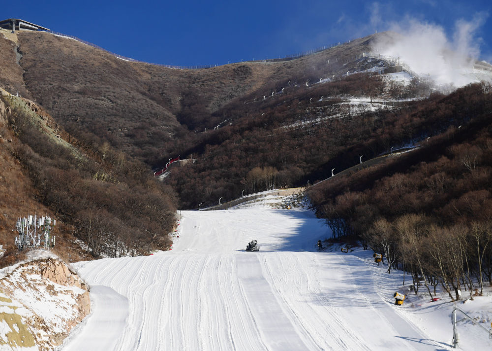 ↑12月29日,工作人员在国家高山滑雪中心雪道上操作压雪车。