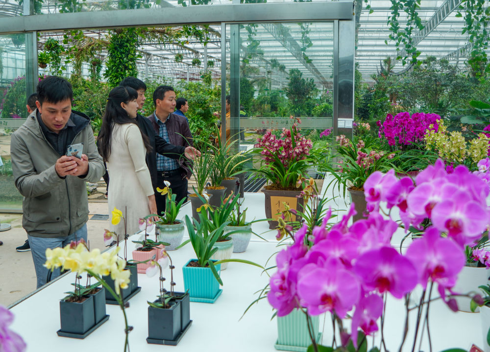 ↑在江西省于都县禾丰兰花小镇,游客正在观赏兰花。新华社记者 郭杰文 摄
