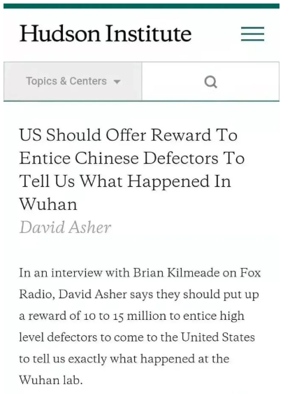 更可笑的是,为了炮制这么一份病毒溯源报告,把病毒起源牢牢锁定在中国,美国哈德逊研究所居然有人建议贴出“悬赏令”,准备拿出1000万-1500万美元,引诱武汉病毒研究所人员“变节”,让他们到美国“承认”问题,将“真相”告诉全世界。这种馊主意自然遭到广大网友群嘲:这不等于公开承认美国情报机构无能?
