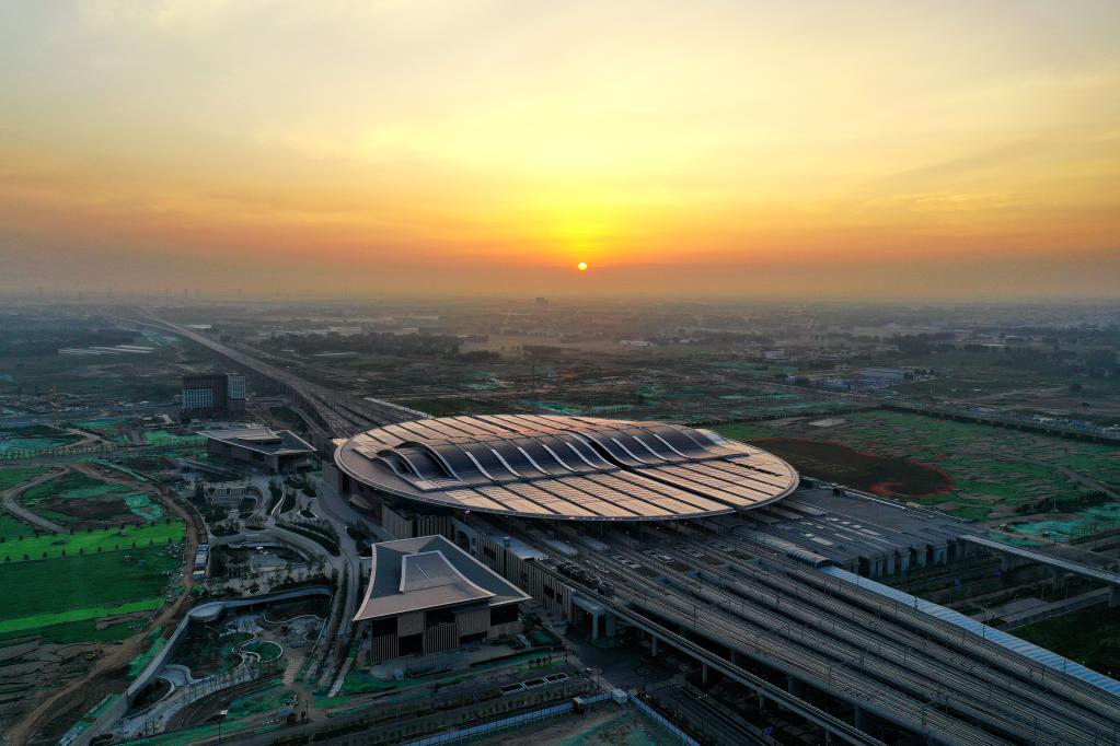 7月1日在河北雄安新区京雄城际铁路雄安站拍摄的日出(无人机照片)。新华社记者 牟宇 摄