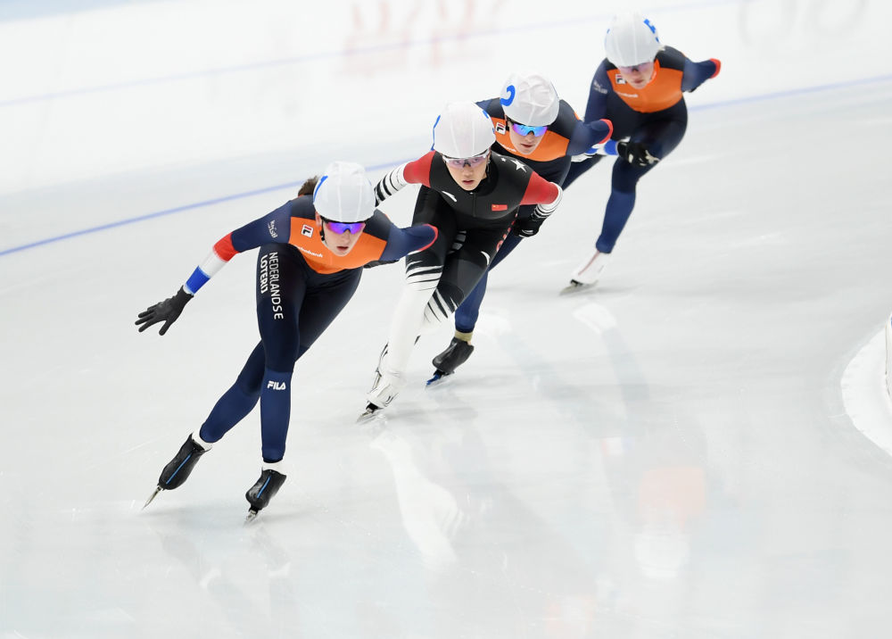 10月10日,荷兰选手莱昂妮·巴特斯和中国选手杨滨瑜等女子速度滑冰选手在“相约北京”系列冬季体育赛事速度滑冰中国公开赛中。新华社记者 张晨霖 摄