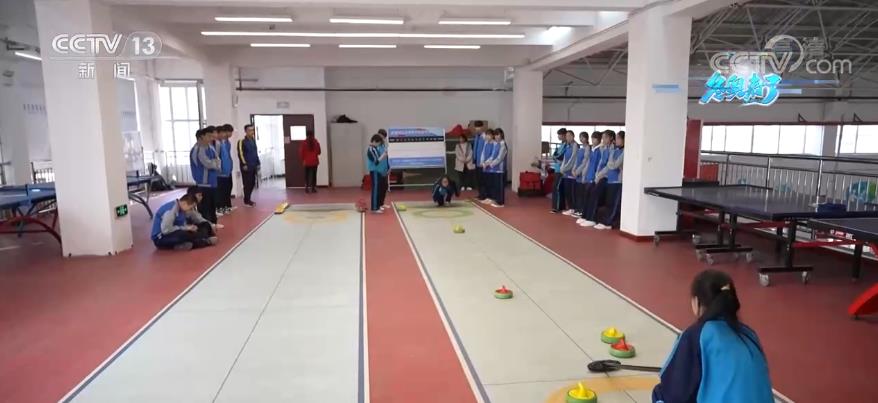 在河北省石家庄市特殊教育学校的旱地冰壶场地,高二年级的学生正在跟随教练的指导,学习冰壶运动的动作知识。像这样的冰壶课堂已经开展了三年时间。