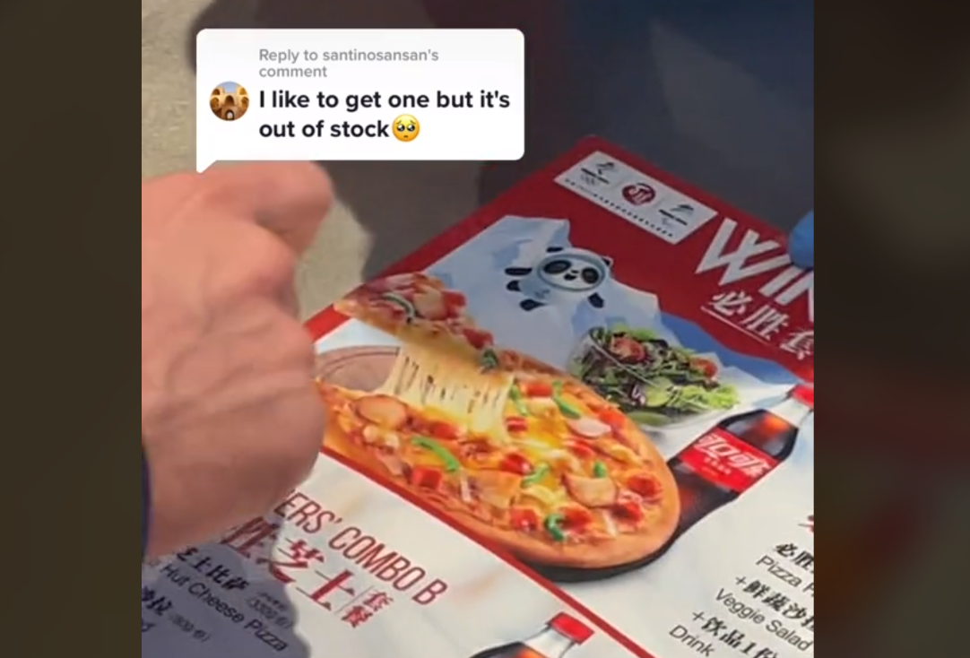 外国小哥先是询问,能否将套餐中的沙拉去掉,换取一个额外的冰墩墩,并称“我想要两个冰墩墩”,旁边还有人应和着说“要三个冰墩墩”。在看到工作人员摇头后,他又问,“那一个披萨、一份沙拉、一个冰墩墩呢?”在场的三名工作人员齐声表示“我们没有冰墩墩”,小哥才连忙说“没关系”。