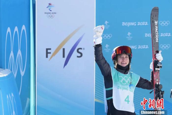 2月8日,在北京首钢滑雪大跳台举行的北京2022年冬奥会自由式滑雪女子大跳台决赛中,中国选手谷爱凌夺得冠军。图为谷爱凌庆祝。中新社记者 毛建军 摄