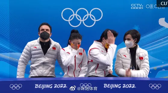 2月12日,中国选手王诗玥(左二)/柳鑫宇(右二)在比赛后等待成绩。新华社记者 曹灿 摄