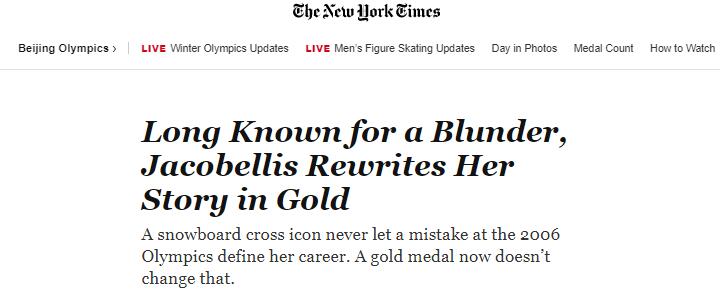 雅各贝利斯是冬奥会“五朝元老”。在2006年都灵冬奥会上,雅各贝利斯在距离终点线不远处不慎摔倒,与金牌失之交臂。在2010年温哥华冬奥会和2014年索契冬奥会上,她都无缘决赛。在2018年平昌冬奥会上,她只获得第四名。这一次,雅各贝利斯终于得偿所愿。