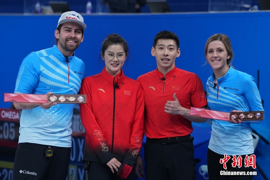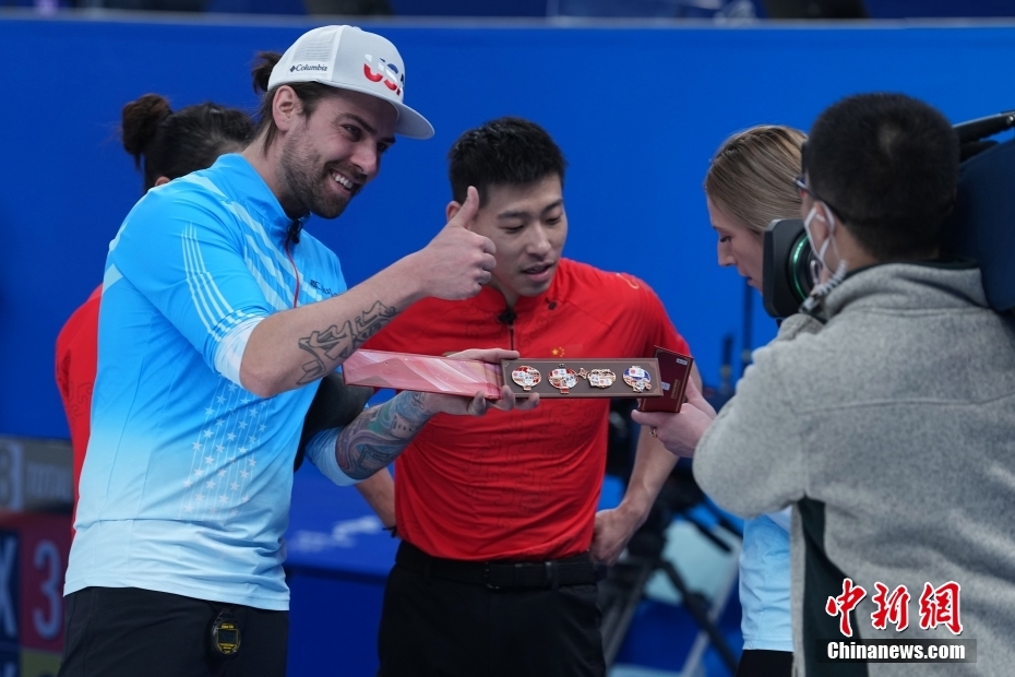 2月5日,北京冬奥会冰壶混双循环赛中,由范苏圆、凌智组成的中国队5比7惜败美国组合。比赛结束后,范苏圆、凌智送给美国冰壶混双组合每人一盒4个冬奥徽章。中新社记者 崔楠 摄