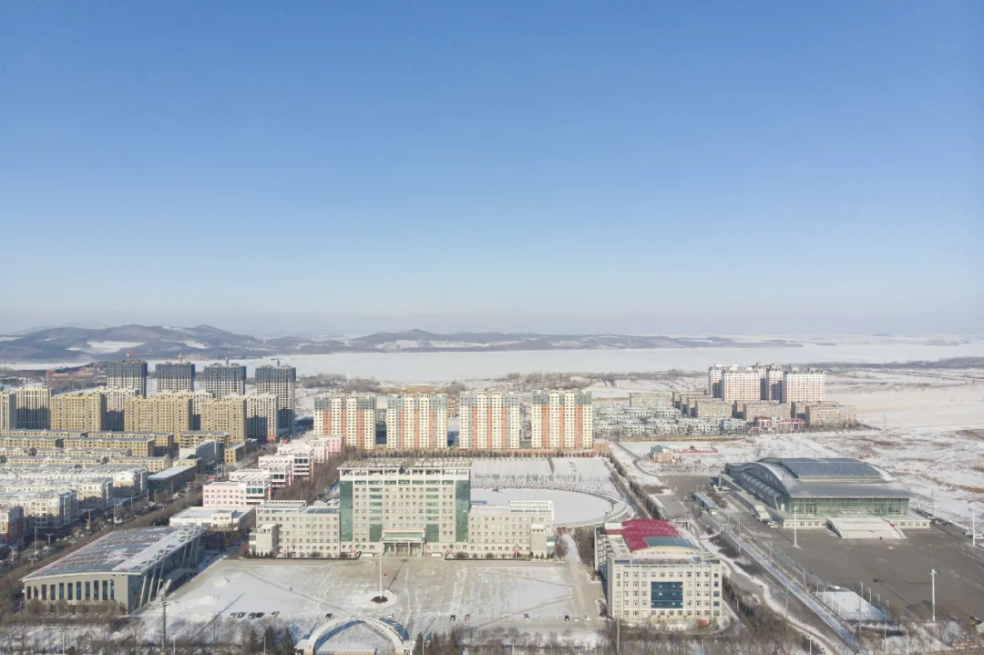 1月12日拍摄的七台河职业学院校园和七台河体育中心(右侧建筑)外景(无人机照片)。新华社记者 张涛 摄