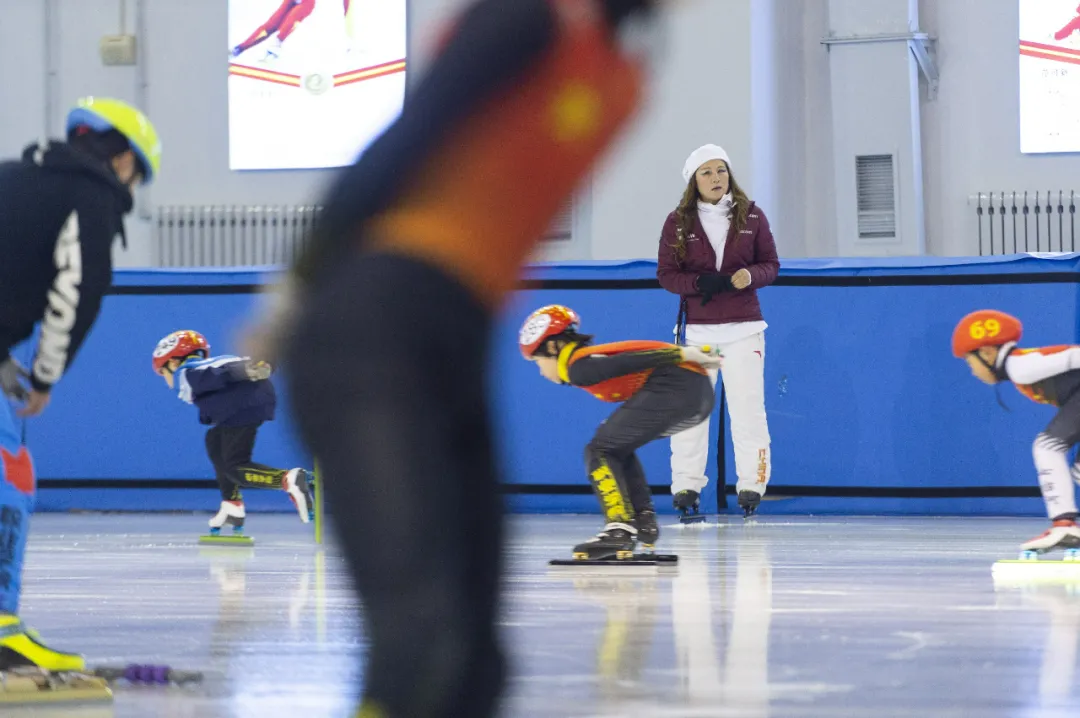 1月10日,在七台河体育中心,七台河职业学院短道速滑训练中心主教练张杰(右二)正在指导训练。张杰是孟庆余的弟子,也是七台河走出的首位世界冠军。新华社记者 谢剑飞 摄