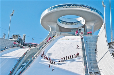 日前,张家口赛区国家跳台滑雪中心工作人员在整理雪面。
