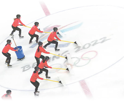 2月6日,国家体育馆清雪保障团队在比赛间隙清扫冰面。