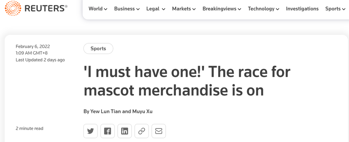 路透社报道称,在北京冬季奥运会周五晚正式开幕几小时后,购物者就开始冒着严寒排起了长队,抢购奥运会熊猫吉祥物“冰墩墩”。