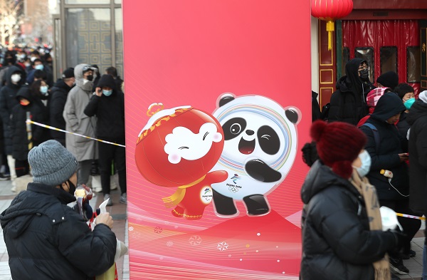 2月7日,北京王府井工美大厦门外,顾客排队购买北京2022官方特许商品。中国日报记者 邹红 摄