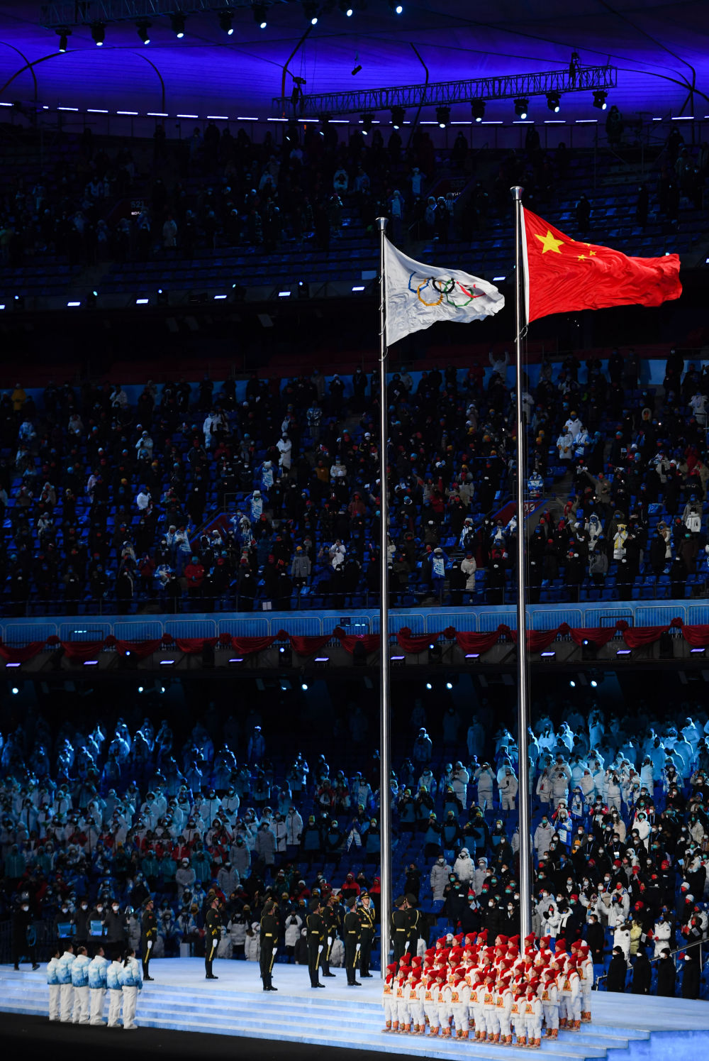 这是奥林匹克会旗与中华人民共和国国旗在开幕式上升起。新华社记者 薛宇舸 摄