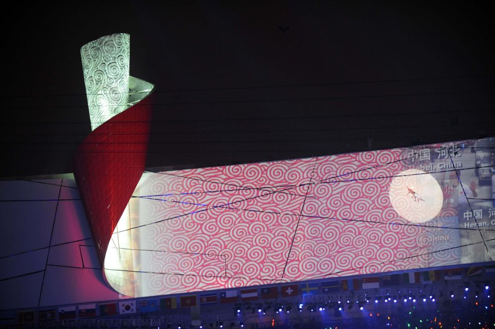 所有观众全体起立行注目礼,“鸟巢”安静了。
