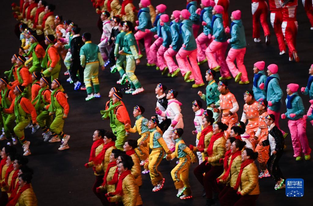 在鸟巢上演的这段持续了约半个小时的广场舞暖场环节中,各年龄段的普通人参与其中,有穿着小老虎服装的小朋友们,有穿着黄色羽绒服、戴着红色围巾的阿姨们,有穿着绿色背带裤的学生们,还有身着拉丁舞风格服装的年轻人们……对了,当然少不了本届冬奥会的吉祥物冰墩墩。冰墩墩被跳跃着的小朋友们围绕着,随着音乐摆动短短的手臂,令人忍俊不禁。