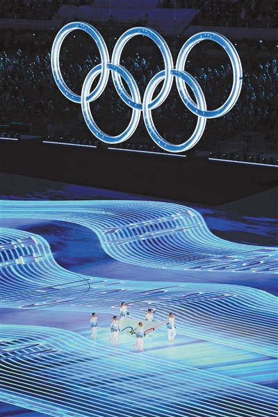 此时,6名冰球运动员出现在场地中,他们击打着“影像冰球”,不断撞向这块巨大的“冰立方”。冰屑滚滚散落,晶莹的冰雪五环破冰而出。这是属于奥林匹克的时刻,这是以奥运精神将世界团结在一起的时刻。