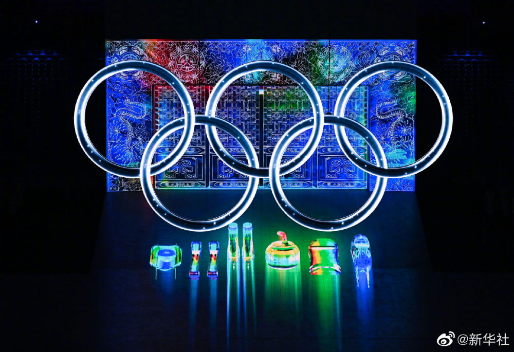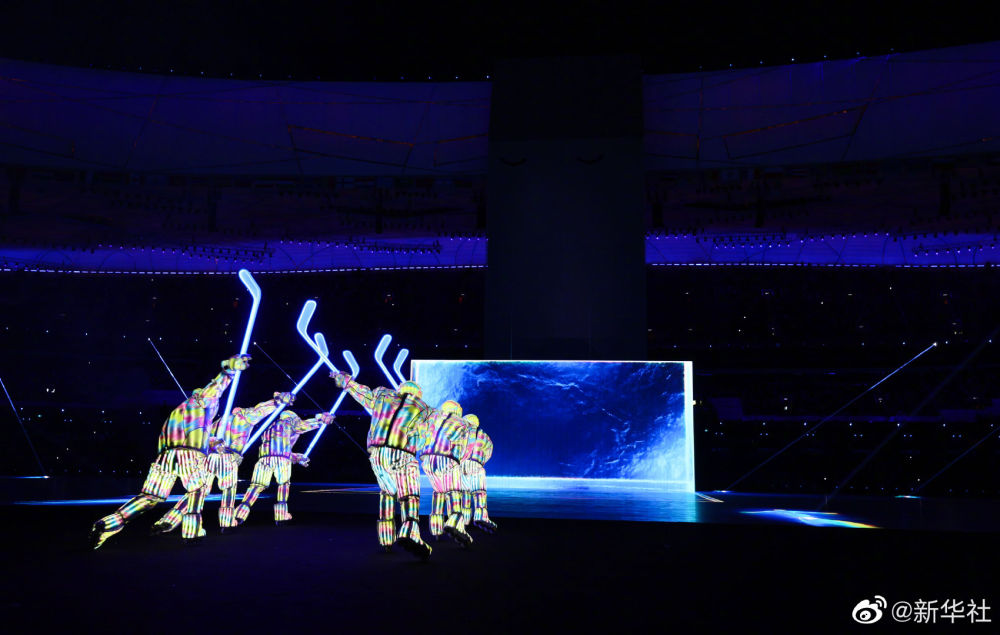展示整个冬奥会的历史。一方巨大的水从冰面中升起,凝固成冰。过往23届冬奥举办城市的历史,随着环绕全场的24道“激光刻刀”的雕琢,闪回其上,最终定格为“2022中国北京”。