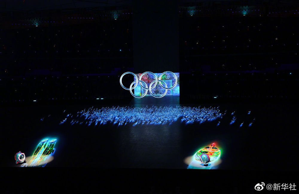 【美轮美奂!北京冬奥会开幕式上冰雪五环有讲究】4日晚,北京冬奥会开幕式上演绎《冰雪五环》。一滴水变成冰。一滴冰蓝色的水墨从天而降,幻化为黄河之水,倾泻而下。整个画面的意境,来自中国古老的诗句“黄河之水天上来”,这是对中国母亲河的浪漫想象和赞美。翻腾的浪涛最终凝结为一片晶莹剔透的冰雪天地,也好像是凝固了时光。