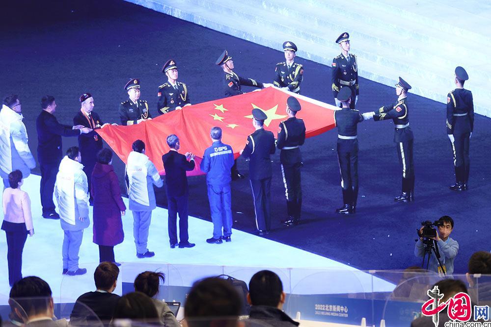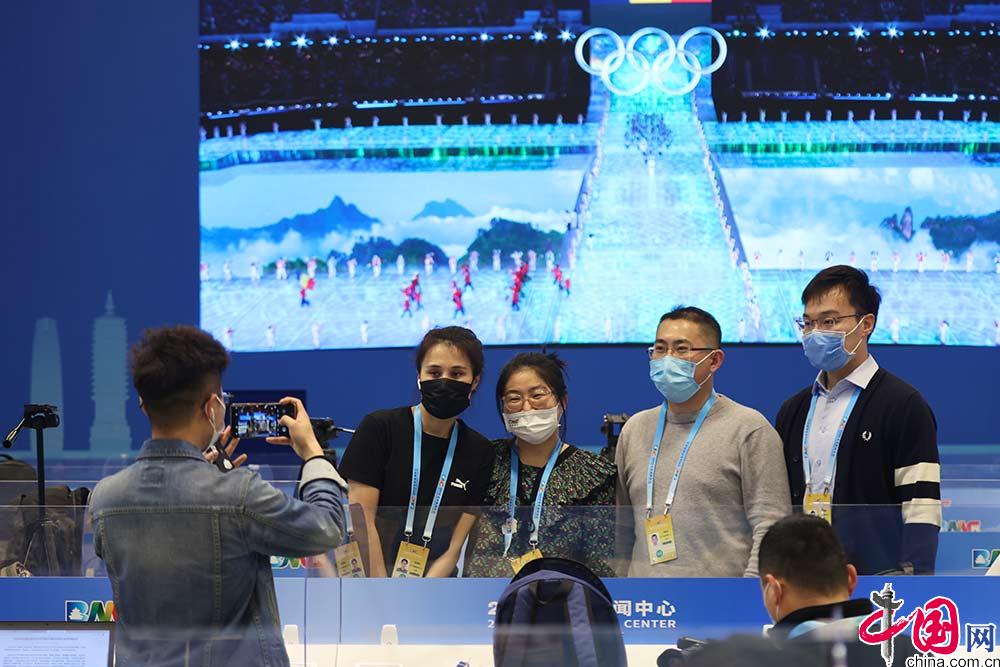 2月4日晚,第二十四届冬季奥林匹克运动会开幕式在北京国家体育场举行。志愿者在2022北京新闻中心合影留念。中国网 伦晓璇摄影