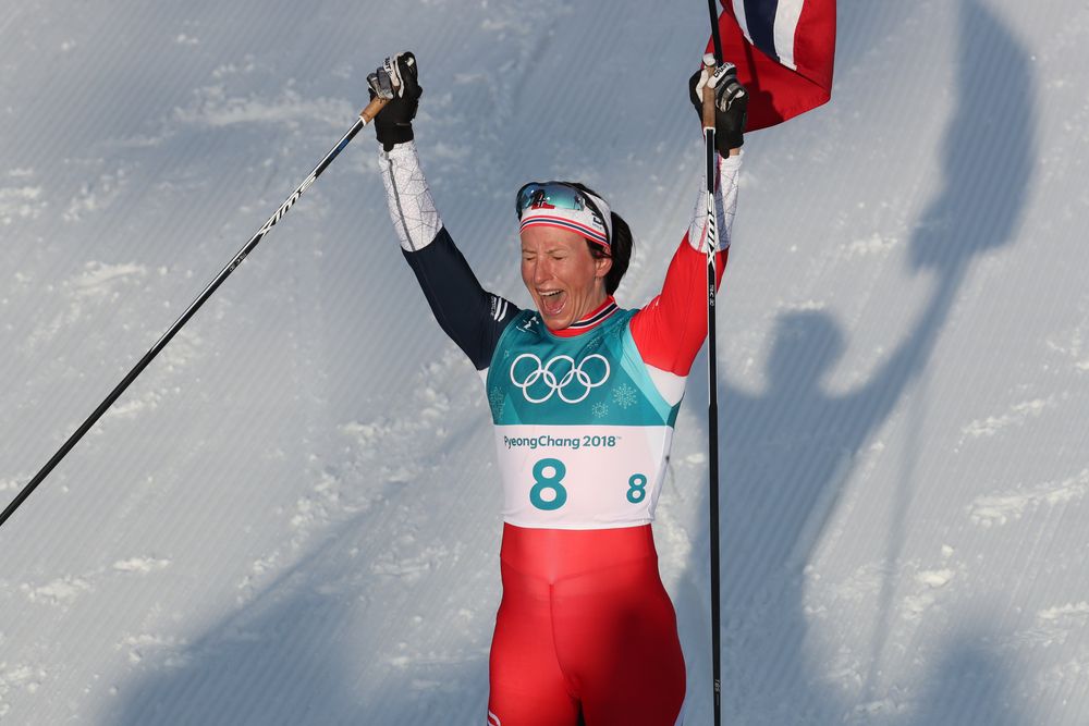2018年2月25日,挪威选手玛丽特·比约根在平昌冬奥会越野滑雪女子30公里集体出发(传统技术)比赛夺冠后庆祝。凭借在平昌冬奥会上获得的2金1银2铜,比约根成为冬奥会历史上第三个“八金王”,并以8金4银3铜总计15枚奖牌,成为冬奥会历史上获奖牌数最多的运动员。新华社记者李钢摄