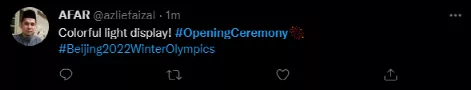 马来西亚网友对开幕式上的灯光表示印象深刻:“五彩斑斓的灯光秀!”↓