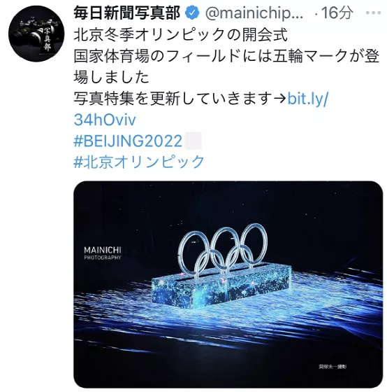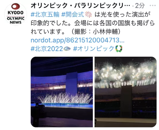 北京冬奥会开幕式节目的光影效果受到了日媒的关注。共同社称:“开幕式上用光呈现的表演让人印象深刻。”↓
