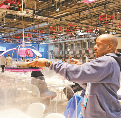 2月3日,一名外国记者在北京冬奥会主媒体中心智慧餐厅取餐。