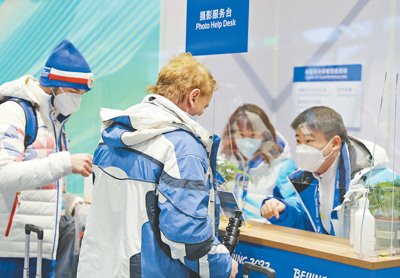 2月3日,在北京冬奥会主媒体中心摄影服务台,志愿者在为外国记者提供服务。