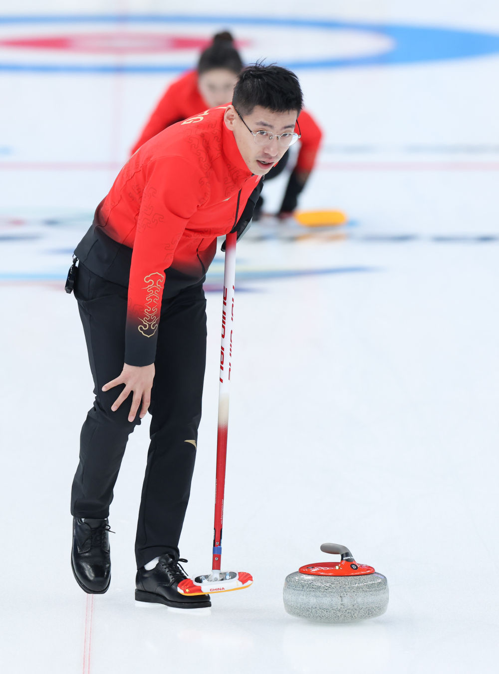 ↑2月2日,中国冰壶队范苏圆(左二)在比赛中。新华社记者 刘续 摄