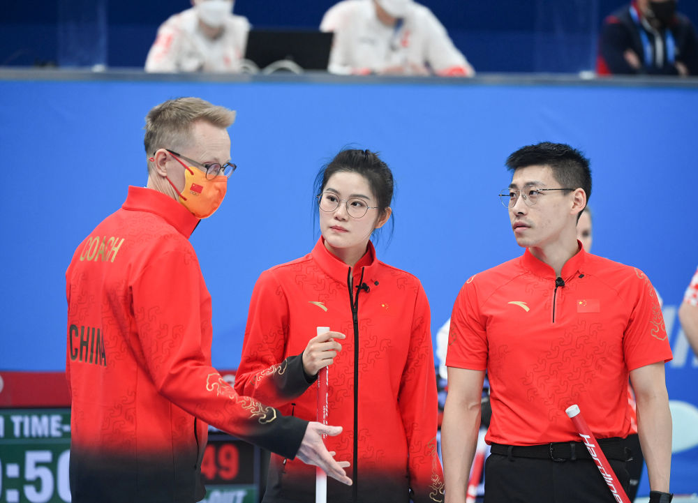 ↑2月2日,中国队选手凌智(右一)、范苏圆(右二)在比赛中接受教练指导。新华社记者 黄孝邦 摄