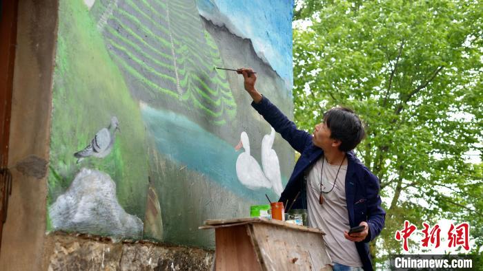 绿水、青山、鸟儿、大白鹅……受村里邀请,连日来,杨军昌忙着为后岱山村一个老房子墙面作画,他将乡村元素融入画中,并拍摄创作短视频。