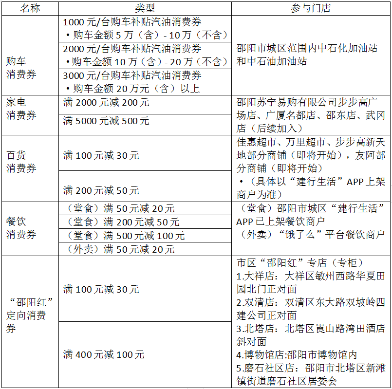 据悉,10月12日,“建行生活”App将发放餐饮、百货零售及“邵阳红”优质农产品等消费券。10月15日,“建行生活”App将发放购车消费券,“云闪付”App将发放家电消费券。其中,购车消费券总价值260万元,凡是在市城区限额以上汽车销售企业购车的个人消费者,凭5万元以上及5万元的购车发票,最高可领取价值3000元的汽油消费券;家电、餐饮、百货、“邵阳红”优质农产品等消费券分别价值40万元、80万元、60万元、20万元,均采用满减的形式,在“建行生活”App和“云闪付”App每天定量发放,有效期限为领券当天或7天内。