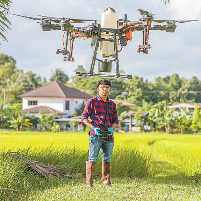近年来,中国制造的农业植保无人机助力泰国农业生产更加高效安全。图为一名泰国农民操作大疆农业植保无人机。
