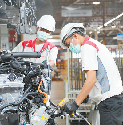 在长城汽车泰国罗勇工厂总装车间内,工人正在对新能源汽车进行底盘合装。
