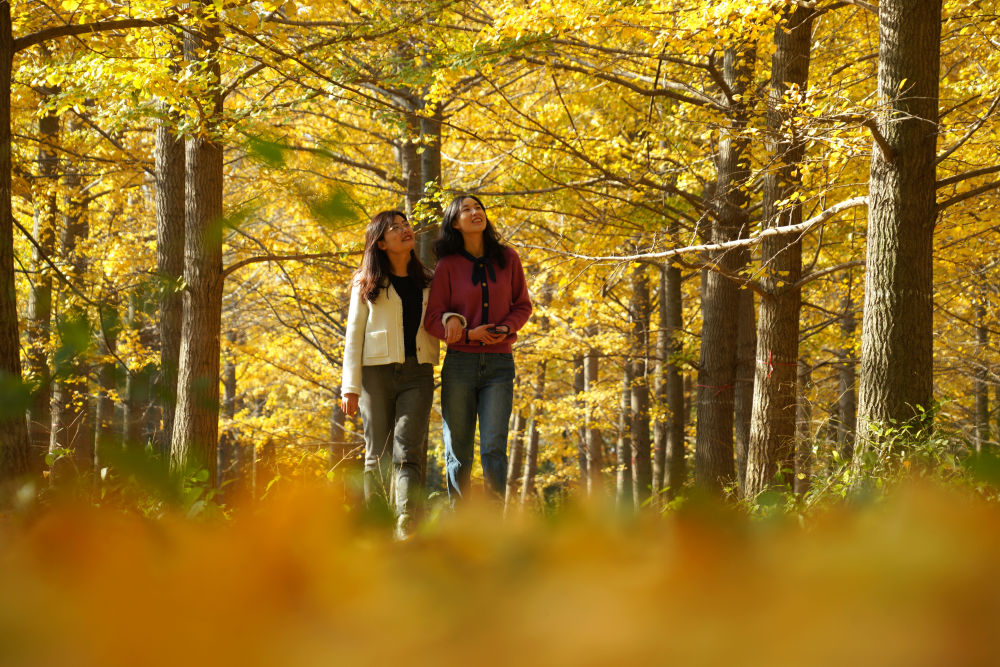 11月2日,游人在山东省临沂县沂南县的银杏林间游玩赏秋。新华社发(尹君 摄)